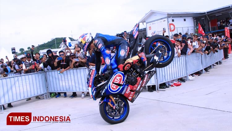 TIMES Jayapura/Pembalap PATA Yamaha Brixx Toprak Razgatlioglu melakukan atraksi stopie ban depan usai memenangi race 1 WSBK Mandalika 2022, Sabtu (12/11/2022). (FOTO: Tria Adha/TIMES Indonesia).