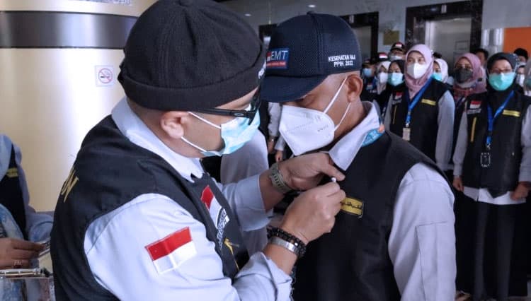 TIMES Jayapura/Kapuskes Haji Kemenkes Budi Sylvana saat menyematkan pin kepada petugas kesehatan haji. (FOTO: dok. Kemenkes)