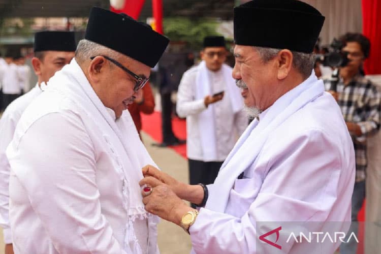 TIMES Jayapura/Pimpinan pesantren Insafuddin Banda Aceh memberikan kain kepada Sekda Aceh Bustami Hamzah usai peringati Hari Santri, di Banda Aceh, Selasa (24/10/2023). (FOTO: ANTARA/HO/Humas Pemprov Aceh)