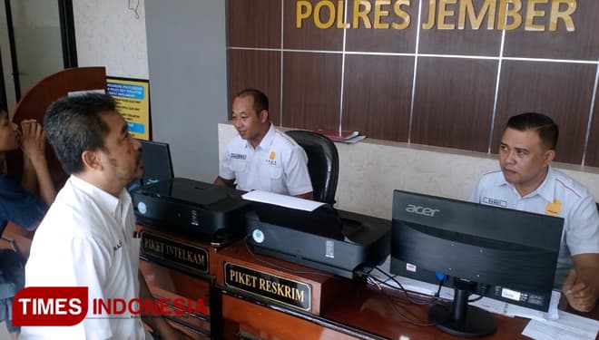 TIMES Jayapura/Wakil Ketua Bidang Litbang dan IT DPD Partai Perindo Kebupaten Jember, Ahmad One Prastiono saat melaporkan Ketua DPD Partai Perindo Kabupaten Jember Hanung Prijobodo ke Polres Jember, Senin (6/5/2019). (FOTO: Dody Bayu/TIMES Indonesia)